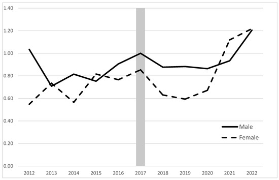 A total of 39,394 procedures were performed at 51 HCOs over the study period. Pre-AUA guideline publication, 9067 endoscopic managements (Males 8044; Females 1023) and 3457 urethroplasties (Males 3246; Females 211) were performed. Post-AUA guideline publication, 15,824 endoscopic managements (Males 14,521; Females 1303) and 7092 urethroplasties (Males 6703; Females 389) were performed. The mean (SD) age of endoscopic management and urethroplasty patients was 67.1 (16.7) and 55.7 (18.3), respectively (p < 0.01). The urethroplasty-to-endoscopic management ratio decreased for males between 2012 and 2013 (from 0.48 to 0.37) and steadily increased from 2013 to 2017 (from 0.37 to 0.52). The ratio steadily increased for females from 2012 to 2017 (0.26 to 0.44). The urethroplasty-to-endoscopic management ratio showed a slight decline from 2017 to 2020 across both males and females before rising again in 2021 and 2022 to a study-wide high (Males: 0.62; Females: 0.63). When scaled such that the 2017 male urethroplasty-to-endoscopic management ratio was standardized to 1, the male urethroplasty-to-endoscopic management ratio was seen to decrease from 1.03 in 2012 to a low of 0.71 in 2013 before steadily increasing to plateau between 0.86 and 0.93 between 2018 and 2021. The first year that the male urethroplasty-to-endoscopic management ratio increased above 1.00 (to 1.20) since 2017 was 2020. Over the same time period, the adjusted female urethroplasty-to-endoscopic management ratio vacillated between 0.55 and 0.85 between 2012 and 2020. The female ratio reached above 1.00 (1.12) for the first time in this study in 2021 before further climbing to 1.22 in 2022.
