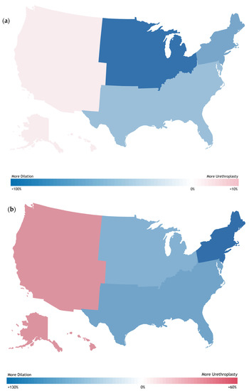 United States Maps Showing Geographic Distribution of (a) Male and (b) Female Urethroplasty–Endoscopic management Ratios in 2022 by Census Region.