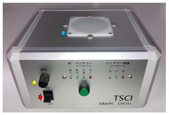 Main unit of TSCI. On the front of the device, there is a tab to switch the 605 nm wavelength light (red arrow), a knob to adjust the light intensity (yellow arrow), and a lamp to check the operation status. In the center of the upper surface of the device, there is a white plate that emits transmitted light from below, and a Petri dish containing the specimen is placed on this plate (blue arrow). Abbreviation: TSCI, target sample check illuminator.