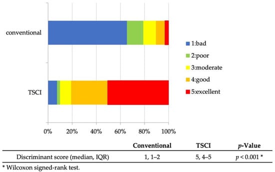 Discriminant scores for EUS-FNA sample (conventional vs. TSCI). Discriminant scores for EUS-FNA samples by the six raters. The TSCI observations had significantly higher discriminant scores than the conventional method. Abbreviations: EUS-FNA, endoscopic ultrasound-guided fine-needle aspiration; TSCI, target sample check illuminator; and IQR, interquartile range.