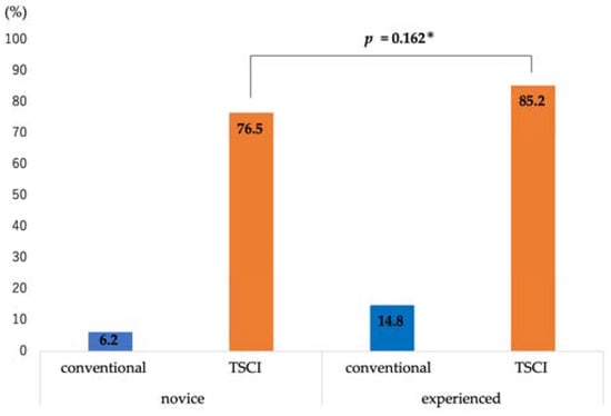 Differences from experience in high discriminant scoring cases. In high-scoring cases (≥4), there was no significant difference between the novice and experienced raters. * Chi-square test. Abbreviations: TSCI, target sample check illuminator.