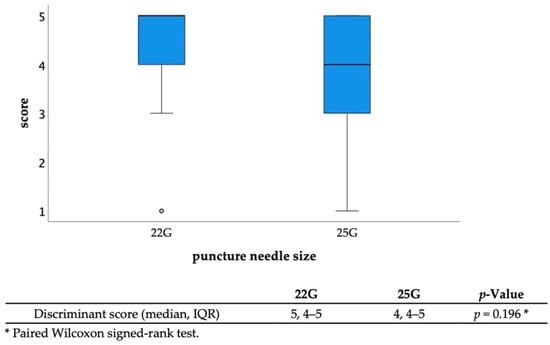 Discriminant scores with different needle sizes (22G vs. 25G). There was no significant difference in the discriminant scores between different puncture needle sizes. Abbreviations: IQR, interquartile range.