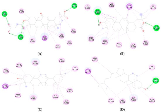 2D Binding orientation in the docked complex of the (A) carbenoxolone Acid, (B) oleanolic acid, β-amyrin (C), and β-sitosterol with 11-β-HSD1 (D). The compound is represented in green. The image was generated using the Discovery Studio Visualizer.
