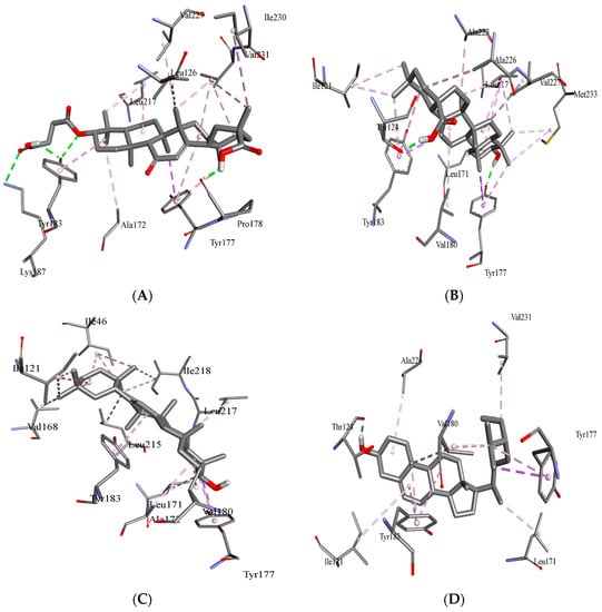 Binding orientation in the docked complex of the carbenoxolone acid (A) and oleanolic acid (B), β-sitosterol (C) and β-amyrin with 11 β-HSD1 (D). The image was generated using the Discovery Studio Visualizer.