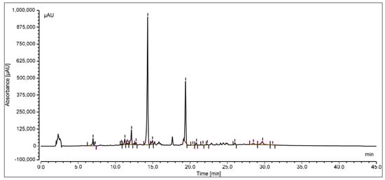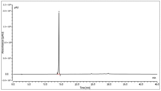 The oleanolic acid in the extract was measured by reversed-phase high-performance liquid chromatography with a photo diode array (PDA) detector. At the stationary phase, an RP-C18 column was used, and at 348 nm, the compound was identified. Peak area versus concentration calibration curves plotted for oleanolic acid followed a straight line, as predicted by linear regression. At Rt14.329, a well-separated peak of oleanolic acid was observed. Oleanolic acid HPLC peaks for the standard and sample are displayed in Figure 3 and Figure 4, respectively. Oleanolic acid was measured at 1.31 ± 0.18% of the extract’s dry weight (w/w).