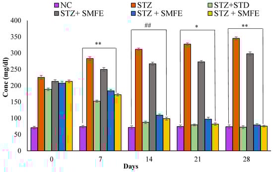 In contrast to normal controls, STZ-induced diabetic mice exhibited significantly higher blood glucose levels (p < 0.01). Compared to the diabetic control group, the 200 mg/kg body weight and 400 mg/kg body weight doses of the SMFE extract caused significant (p < 0.05 and p < 0.01) reductions in blood glucose at 21 and 28 days, respectively. Additionally, when glibenclamide was given to group III at a 5 mg/kg dose, blood glucose levels dropped significantly (p < 0.01) on days 14, 21, and 28. Groups IV and V received SMF extract at doses of 200 and 400 mg/kg body weight, respectively, and showed a significant (p < 0.05 and 0.01) drop in blood glucose levels after 14, 21, and 28 days. On day 14, a maximum decrease in fasting BGL was observed (Figure 6).