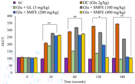 Effects of SMF extract on oral glucose tolerance test in mice. Data are represented as the mean ± SEM (n = 6). ** p < 0.01 = significant when compared with diabetic control group normal mice. * p < 0.05 = significant when compared with diabetic control. ns p > 0.05 = non-significant when compared with diabetic control. NC = normal control; SMFE = S. mangifera fruit extract; OGTT = oral glucose tolerance test; Gl = glibenclamide; Glu = glucose; DC = diabetes control.