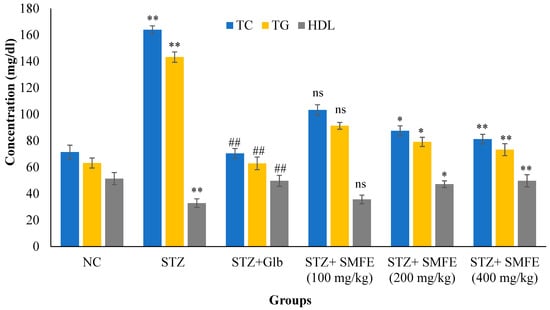 The impact of alcoholic extracts of SMFE on lowering hyperlipidemia in mice with STZ-induced diabetes showed an increase in TC and TG levels after 28 days of therapy in the diabetic control group, whereas decreases were seen in HDL. Due to the inefficient use of glucose, diabetes-related hyperlipidemia is caused by an increase in fat mobilization from adipose tissue [47]. More fatty acids are released into the bloodstream from stored triacylglycerols in a diabetic condition because hormone-sensitive lipase is more efficient at converting them. Because of this, the liver is stimulated to produce more phospholipids and cholesterol from its surplus of fatty acids. Lipoproteins are created when phospholipids, cholesterol, and excess TG are released into the bloodstream [48].