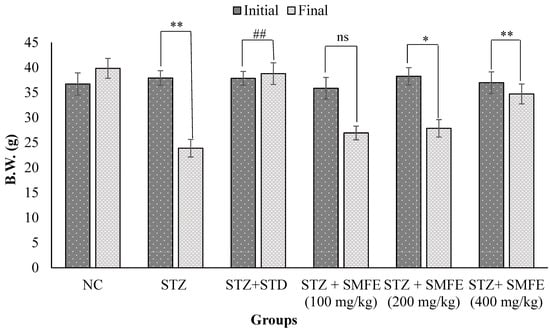 Effects of SMF extract and glibenclamide on body weight in mice. Data are represented as the mean ± SEM (n = 6). ** p < 0.01 = significant when compared with diabetic control group normal mice. * p < 0.05 and ## p < 0.01 = significant when compared with diabetic control. ns p > 0.05 = non-significant when compared with diabetic control. NC = normal control; STZ = streptozotocin; SMFE = S. mangifera fruit extract; STD = standard drug (glibenclamide).