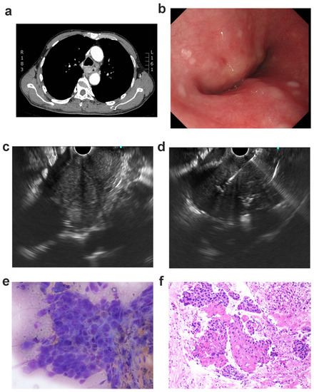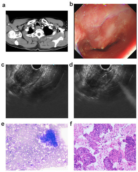 Medical information of patient 14: (a) thoracic computed tomography (CT) depicted the thickening of the esophageal wall at the middle esophagus; (b) endoscopy depicted esophageal stricture with intact mucosa; (c) EUS (endoscopic ultrasound) depicted low-echo lesion at the upper esophagus; (d) EUS depicted needle puncture through the esophageal tissue; (e) rapid on-site evaluation depicted malignant cells; (f) histological studies with hematoxylin and eosin (H&E) staining showed malignant cells of well-differentiated squamous cell carcinoma captured by EUS-FNA.