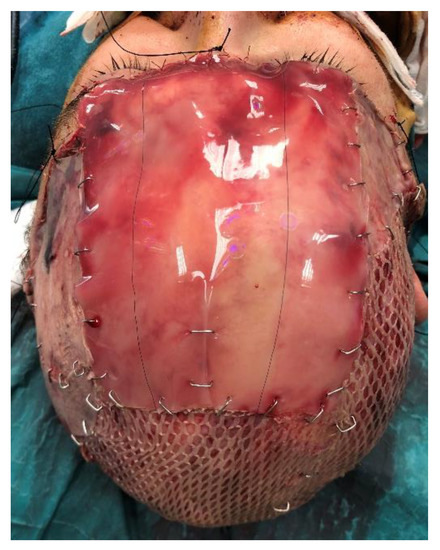 Schonauer et al. [13] described the use of STSGs to reconstruct major full-thickness scalp defects up to 350 cm2. A variety of dermal alternatives have been described for the coverage of scalp wounds. Integra® (LifeScience Corp., Plainsboro, NJ, USA) and Matriderm (Dr Suwelack Skin and Health Care AG, Billerbeck, Germany) were first use in burn patients but their application was later expanded to reconstructive surgery in relation to chronic wounds [14,15]. Integra® is a bilaminate synthetic construct consisting of an outer silicone layer and a porous inner collagen–glycosaminoglycan (chondroitin-6-sulfate) matrix. It is placed onto vascularized soft tissue, sutured into place, and secured with a bolster dressing for three to four weeks, so that the granulation tissue can prepare the wound bed to receive a staged skin graft. In some rare cases, it may be left to close secondarily.