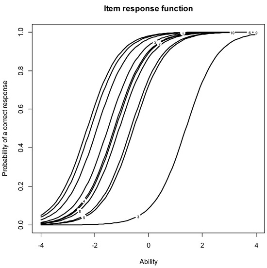 - Hambleton, R.K.; Swaminathan, H. Item Response Theory: Principles and Applications; Springer Science & Business Media: Berlin/Heidelberg, Germany, 2013. [Google Scholar]
