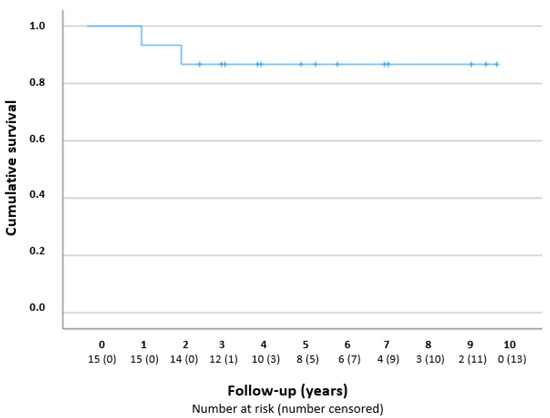 Kaplan–Meier curve—cumulative survival after one goniotomy procedure in years. The number at risk is reported per year during the follow-up.