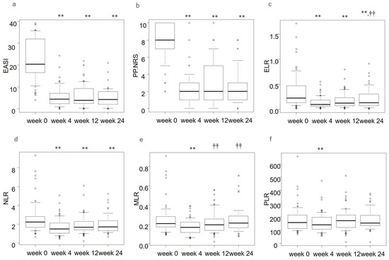 The transition of the eczema area and severity index (EASI) (a), peak pruritus-numerical rating scale (PP-NRS) (b), eosinophil-to-lymphocyte ratio (ELR) (c), neutrophil-to-lymphocyte ratio (NLR) (d), monocyte-to-lymphocyte ratio (MLR) (e), and platelet-to-lymphocyte ratio (PLR) (f) at weeks 0, 4, 12, or 24 of upadacitinib treatment in patients with atopic dermatitis (n = 65). The thick lines in the boxes are medians, and the boxes are interquartile ranges. ** p < 0.01 versus the value of week 0; †† p < 0.01 versus the value of week 4, analyzed by Friedman’s test.