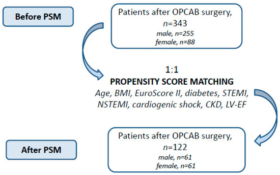 Our study was a retrospective analysis of a double center-retrospective OPCAB cohort, which included 343 patients who underwent off-pump coronary artery bypass procedure for coronary artery disease from January 2017 until November 2022 in the University hospitals in Cologne and Tuebingen. We formed two groups to investigate potential sex-related differences in early clinical outcomes: men (n = 255) and women (n = 88). To account for the unequal cohort sizes, we performed a propensity score-based matching (PSM) analysis using the methods previously described [22]. The details of the analysis are provided in Figure 1.
