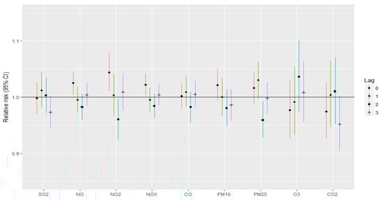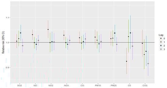 According to our lag analysis, NO, NO2 and NOx lag 0 were significantly associated with stroke incidence, while lags 1–3 were not related with increased risk for stroke or for myocardial infarction. Moreover, SO2 lagged 2 days and PM2.5 lagged 2 days were significantly related with an increased incidence of myocardial infarction. Although the RRs for stoke and myocardial infarction were not significant for other pollutants and lags, RRs for NO, NO2, NOx, SO2 as well as for PM10 and PM2.5 were mostly greater than 1 for lags 0 and 1. The results suggest that the effects of PM2.5 are acute in terms of CVD deaths. Other studies discovered similar findings. Results from a national study in the United States showed that on lag day 0 and 1, PM2.5 had the largest effect on CVDs []. Another study in Beijing also discovered PM2.5′s lag effects within 0–3 lag days []. According to the lag analysis of Tian et al., the lag association of PM2.5 with CVD mortality was statistically significant from lag day 0 to 3 []. In our study, the strongest association between PM10 atmospheric concentration and incidence of stroke and myocardial infarction occurred for lags 0 and 1. Similar results were assessed by Fisher et al. According to the results of his case-crossover analysis, the strongest association of PM10 on ischemic stroke was for the lag 0 period []. This association was also observed by other authors [,,,].