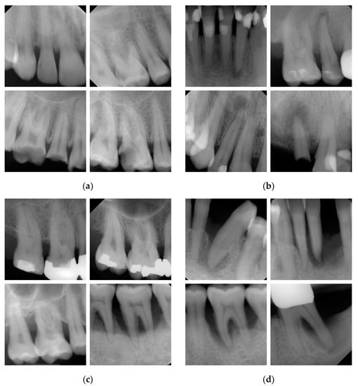 The following diagnostic criteria were chosen for the inclusion of a radiographic image: (1) Periapical radiographs from lower and upper incisors, canines and molars were selected. (2) An image showing the full extent of the main teeth was needed. (3) All X-rays required correct levels relating to exposure, contrast and brightness. Images of teeth with quality defects such as distortions, prominent superimposing effects or others were not selected. (4) At least one radiographic finding—dentin caries, periapical pathology, PBL or endo-perio lesion—should be shown on each image. Finally, 150 periapical radiographs that met the inclusion criteria were identified, and each was assigned a unique identification number.