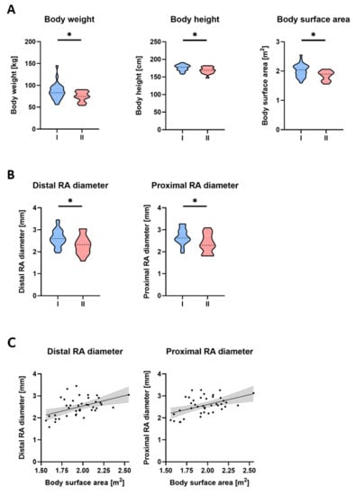 Body surface area of the whole cohort was significantly associated with distal as well as proximal internal RA diameters.