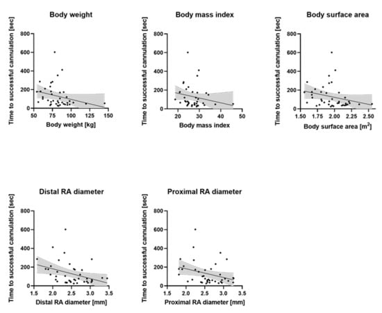 Time needed for successful radial artery (RA) catheterization with lower body weight, height and surface area as well as with smaller distal (at the level of the styloid process) and 5 cm proximal internal RA diameters were measured.