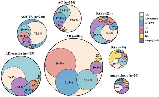 The pattern of allergic conditions in the 1273 patients. Physician-diagnosed allergic rhinitis (AR), asthma (AS)/cough variant asthma (CVA), atopic dermatitis (AD)/eczema, food allergy (FA), allergic conjunctivitis (AC), drug allergy (DA), anaphylaxis, and the overlap of the diagnoses in the study. For example, 26.4% of patients with physician-diagnosed AR also have AC diagnosis, 21.5% AS/CVA, 21.4% AD/eczema, 10.2% FA, 1.7% DA, and 0.6% anaphylaxis.