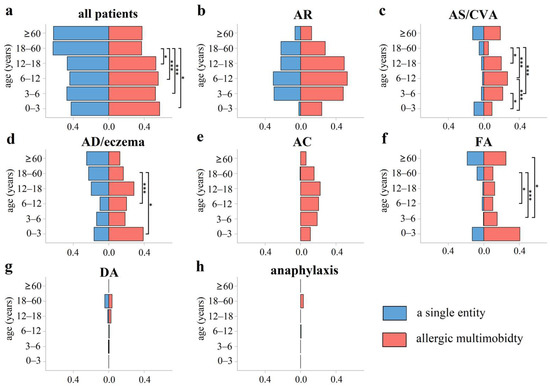 The proportion of allergic multimorbidities and a single entity by age. (a) All patients; (b) AR; (c) AS/CVA; (d) AD/eczema; (e) AC; (f) FA; (g) DA; (h) anaphylaxis. In general, allergic multimorbidities were more common in children’s groups and adolescents than the adult group (18–60 years old). Children of preschool age (3–6 years), school age (6–12 years), and the adolescent group (12–18 years) were more susceptible to AS/CVA multimorbidities than the adult group (18–60 years). The incidence of AD/eczema alone in the adult group (18–60 years old) was higher than that in school-age (6–12 years old) children and infants (0–3 years old) (both p < 0.05). In addition, the incidence of FA multimorbidities was lower in the adult group (18–60 years old) than that in school age (6–12 years old) and preschool age (3–6 years) children (both p < 0.05). *: p < 0.05; ***: p < 0.001.