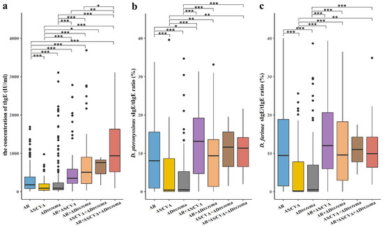 We further explored the relationship between mite sIgE of D. pteronyssinus or D. farinae and tIgE (sIgE/tIgE ratio) in the above seven allergic conditions. The results showed that the D. pteronyssinus sIgE/tIgE ratio was higher in patients with upper airway multimorbidities, such as AR co-occurring with AS/CVA or AD/eczema, and the AR entity was higher than AS/CVA or AD/eczema (all p < 0.05). The D. farinae sIgE/tIgE ratio was similar to that in D. pteronyssinus (shown in Figure 3b,c).