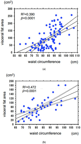 The VFA measured by CT showed a strong positive correlation with WC in both men (R2 = 0.390, p < 0.0001) and women (R2 = 0.472, p < 0.0001) as shown in Figure 1. In Japanese HD patients, 100 cm2 of VFA corresponded to a WC of 85 cm in men and 90 cm in women, thus confirming the validity of the modified criteria.