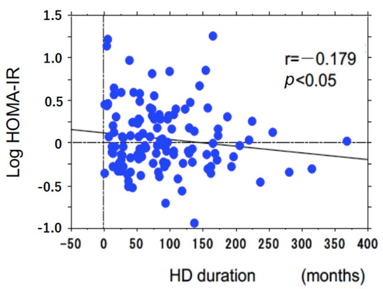 The relationship between HOMA-IR and HD duration (months) (p < 0.05, r = −0.179). Abbreviations: HOMA-IR Homeostasis Model Assessment of Insulin resistance, HD hemodialysis.