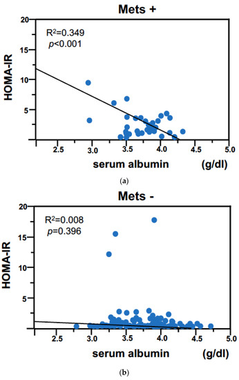 The relationship between HOMA-IR and serum albumin in patients with Mets (a) and relationship between HOMA-IR and serum albumin in patients without Mets (b).