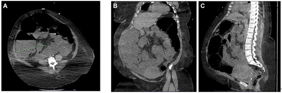 (A) Abdominal CT scan axial section showing the massive dilation of the caecum; (B) CT scan coronal section showing the dilation of the entire colon; (C) sagittal view.