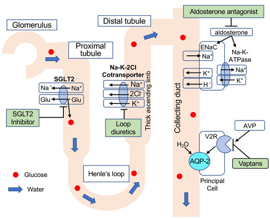 Point of action and mechanism of each diuretic. Loop diuretics inhibit Na+/K+/2Cl− co-transporters in the ascending limb, thereby inhibiting Na+/K+ absorption. Diuresis is indicated by increased Na+ excretion. Aldosterone binds to aldosterone receptors and subsequently upregulates epithelial sodium channel (ENaC) in the collecting duct, which promotes apical Na+ reabsorption. Aldosterone also activates basolateral Na+/K+-ATPase for Na+ excretion from the cell to the interstitial fluid and K+ absorption from the interstitial fluid to the cell. Inhibition of these reactions by aldosterone antagonists increases urinary Na+ excretion, resulting in diuresis. AVP binds to vasopressin receptor type 2 (V2R) and upregulates the expression and translocation of aquaporin-2 (AQP-2) to the cell membrane on the luminal side of the tubule, resulting in water reabsorption. Vaptans antagonize arginine vasopressin (AVP) and inhibit H2O channel activity. Thus, water diuresis occurs.