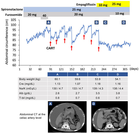 Clinical course of our case. This case was a 59-year-old Japanese man (patient 5 in Table 1). Since his renal function became worse after using diuretics, concentrated ascites reinfusion therapy (CART) was selected. After six rounds of CART, administration of empagliflozin was started. Subsequently, the ascites improved markedly. Red arrows indicate CART administration. Clinical data and radiological examinations (A) before CART, (B) just prior to empagliflozin administration, (C) after using empagliflozin for 28 days, and (D) after using empagliflozin for 3 months. This figure was adapted from a previous study [21].