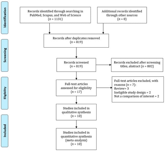 Study Identification: Figure 1 shows the flowchart of the study selection process in this study. The electronic databases search yielded 1131 articles; 312 of these were excluded for duplication. Moreover, 802 articles were further excluded due to irrelevant titles or abstracts. Thus, 17 full-text articles were screened, and 7 studies were further excluded due to being reviews, not a comparison of interest, and having ineligible study designs. Finally, 10 studies were included in this meta-analysis [,,,,,,,,,].