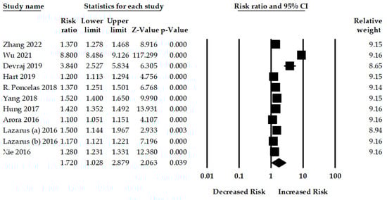 Statistical Analysis: The statistical analysis was performed using Comprehensive Meta-analysis (CMA) software. The pooled risk ratios (RR) with 95% confidence intervals were estimated using a random effects model based on the DerSimonian–Laird method. We drew forest plots to depict the visual interpretation of pooled estimates with 95% CIs. The Cochran Q test and I2 statistic were calculated to assess the degree of heterogeneity among studies. The significance level for the effect size was considered at p < 0.05.