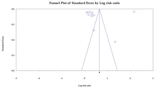Publication Bias: Figure 3 shows the funnel plot of the association between PPI use and the risk of CKD. This Egger’s regression plot indicates no significant publication bias (p = 0.53).