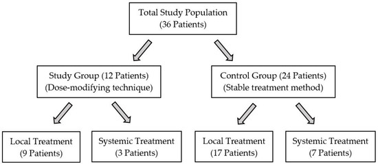 In the control group, 7 patients received systemic and 17 patients received local treatment. For the locally treated patients, the median corticosteroid dose was significantly lower in the study group (130 mg vs. 200 mg; p < 0.01), whereas the median treatment duration was significantly longer (24 weeks vs. 20 weeks; p < 0.05). For systemic treatment, both median corticosteroid dose (7308 mg vs. 12,105 mg; p < 0.01) and median treatment duration (18 weeks vs. 28 weeks; p = 0.01) were significantly lower in the study group.