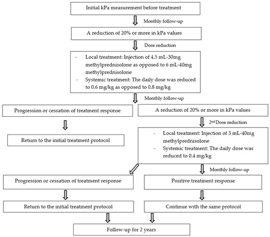 After first reducing the corticosteroid dose, patients were monitored on a monthly basis; if the treatment response persisted, the dose was reduced once more. The amount of injected solution for locally treated patients decreased to 3 mL-20 mg methylprednisolone instead of 4.5 mL-30 mg. For systemic treatment, the daily dose was reduced to 0.4 mg/kg/d instead of 0.6 mg/kg/d methylprednisolone acetate (Figure 3).