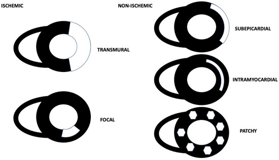 For our purposes, we grouped and analyzed the samples according to ischemic (focal or transmural) and non-ischemic LGE patterns (Figure 1). The ischemic pattern was defined as a subendocardial area of enhancement at the CMR sequences acquired after gadolinium contrast agent administration. Non-ischemic patterns were defined as any LGE area presenting an intramyocardial, subepicardial, or patchy enhancement distribution [13].
