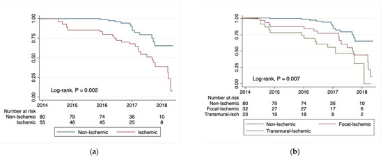 The ischemic group presented the worst prognosis (log-rank test: p = 0.007), especially in the transmural pattern. On the contrary, the focal and the non-ischemic ones had a better prognosis (log-rank tests: p = 0.002) (Figure 2).
