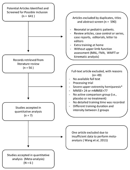 A total of 641 potentially relevant studies were identified according to the initial literature search strategy. Subsequently, 590 of these studies were excluded based on reviewing the title and abstract, including exclusion of any duplicated articles. After full-text review, an additional 49 studies were excluded from the remaining 56 studies for varying reasons, such as studies that included participants exhibiting serious cognitive deficits, severe upper extremity hemiparesis, or studies including different training durations and intensities between two groups. One of the remaining seven studies was excluded due to insufficient data to perform meta-analysis [37]. In total, six randomized controlled trials were included in the final meta-analysis (Figure 1).