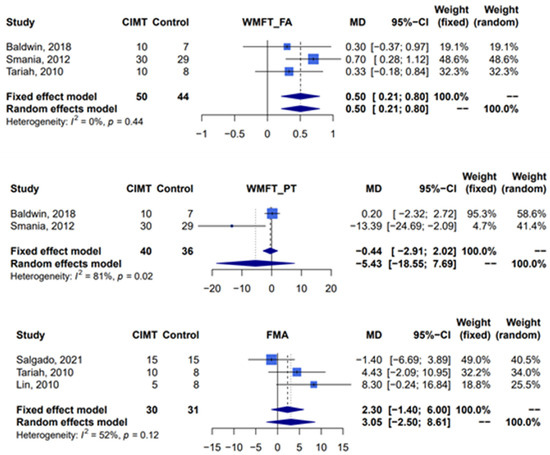 Meta-analysis of Wolf Motor Function Test and Fugl-Meyer assessment. CIMT, constraint-induced movement therapy; WMFT, Wolf Motor Function Test; FA, functional ability; PT, performance time; FMA, Fugl-Meyer assessment; MD, mean difference; CI, confidence interval [10,11,17,39,40].