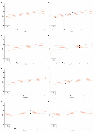 Meta-regression analysis: (A) evaluate the efficacy of constraint–induced movement therapy among patients with different post–stroke duration by using the amount of use scale of the Motor Activity Log; (B) evaluate the efficacy of constraint-induced movement therapy among patients with different post–stroke duration by using the quality of movement scale of the Motor Activity Log; (C) evaluate the efficacy of intervention time by using the amount of use scale of the Motor Activity Log; (D) evaluate the efficacy of intervention time by using the quality of movement scale of the Motor Activity Log; (E) evaluate the efficacy of constraint time by using the amount of use scale of the Motor Activity Log; (F) evaluate the efficacy of constraint time by using the quality of movement scale of the Motor Activity Log; (G) evaluate the efficacy of training hours per week by using the amount of use scale of the Motor Activity Log; (H) evaluate the efficacy of training hours per week by using the quality of movement scale of the Motor Activity Log.
