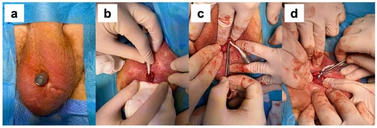 We adopted a conservative treatment in two cases of scrotal port erosion, removing the port and keeping the cushion in place. According to good clinical practice, it is imperative to remove the entire device in case of extrusion due to the high risk of infection. For instance, two patients opposed the removal of the device, having achieved an excellent state of continence, and accepted the procedure after appropriate counseling. In both cases, the port was removed under local anesthesia, with the residual portion of the connections closed with non-absorbable sutures and full-dose antibiotic therapy with cephalosporins continued for a week (Figure 2). In both cases, there were no complications after the procedure, there were no episodes of device infection, and the previously achieved state of continence was maintained.