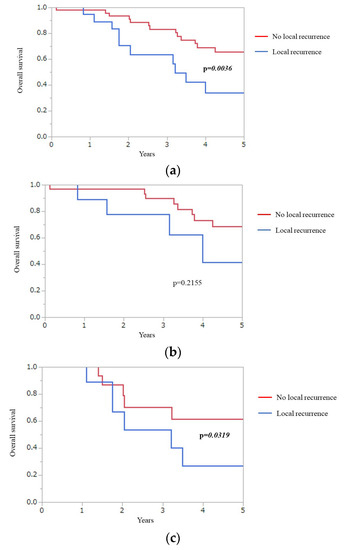 Figure 2 presents Kaplan–Meier plots of the presence or absence of local recurrence in total (Figure 2a), wtKRAS (Figure 2b), and mKRAS (Figure 2c) groups. Five-year OS of patients with local recurrence and without local recurrence was 34.0% and 65.8%, respectively, in total. The local recurrence group had a significantly worse 5-year OS than the non-local recurrence group in total (p = 0.0036). For mKRAS, the 5-year OS of the local recurrence group (26.6%) was also significantly worse than that of the non-local recurrence group (61.3%) (p = 0.0319).