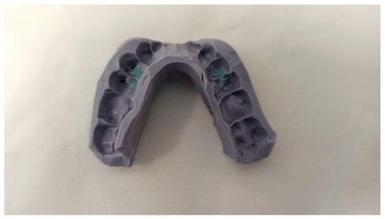 The study protocol consisted of two phases: (1) non-splint measurement; (2) splint measurement. A random choice was performed for the initial measurement. The women completed two masticatory tasks (resting activity and tooth clenching) with and without soft stabilization splints between the teeth. Soft stabilization splints were fabricated directly in the women’s mouths using Variotime® Easy Putty material [,]. Each splint was 4 mm thick, measuring between the upper and lower premolars. The base and catalyst of the silicone material were mixed by hand according to the manufacturer’s directions and formed into a cylinder. The material was then placed onto the patient’s lower arch covering every tooth. To ensure proper thickness, two 2-mm thick Fleximeter® Strips were placed on both sides of the cylinder in the premolar region. Then the patient was asked to close her mouth until the teeth touched the Fleximeter® Strips [,]. The excess of each splint was cut off using a scalpel to provide maximum comfort to the patient while maintaining a stable position for the mandibular and maxillary arches (Figure 1).