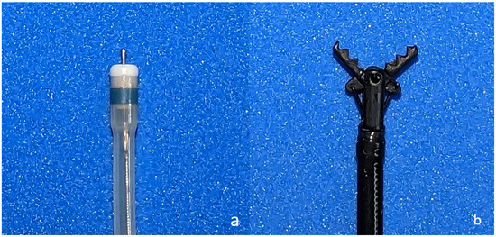 (a) Dual knife (KD-650Q; Olympus, Tokyo, Japan); (b) Clutch Cutter (DP2618DT-35-; Fujifilm Medical, Tokyo, Japan).