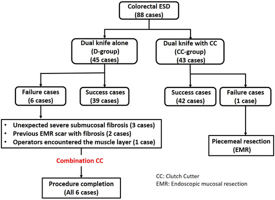 Endoscopic submucosal dissection (ESD), which enables en bloc resection and detailed pathological diagnosis, has provided an excellent outcome for curative resection of gastrointestinal (GI) neoplasms at early stage [1,2]. However, compared to other organs (esophagus and stomach), colorectal ESD (C-ESD) is considered more difficult due to the anatomical features. The colorectum has the anatomical characteristics of a thin wall and rich folds and bends, which causes an intraoperative perforation with the higher rate. Accordingly, C-ESD requires sophisticated techniques even by experienced specialists. Although the knives dedicated for ESD have been recently developed to facilitate C-ESD, the choice of these knives remains unclear [3]. A needle type of knife has been commonly used for C-ESD. The main concern is intraoperative perforation, especially when operators use the knife perpendicularly to the muscle layer. Consequently, its usage may be associated with a high rate of adverse events (AEs), longer procedure time, and the need for more skillful endoscopic techniques [4]. During submucosal dissection, conventional knives, such as the needle knife and ball tip type of IT knife (Olympus, Tokyo, Japan), gently push the knife into the submucosal tissue and cut it with electrosurgical current. This cutting manner has the potential of electrosurgical burning to the muscle layer, leading to increased risk of intra/postoperative AEs [5]. To reduce the AEs risk related to ESD with a conventional knife, a grasping-type scissor (Clutch Cutter [CC]; Fujifilm Medical, Tokyo, Japan), which can accurately grasp, pull, coagulate, and/or incise the targeted tissue, was developed [5]. In detail, CC can simultaneously achieve hemostasis and cut vessels, hold the targeted tissue, and dissect safely at the confrontation part of the muscle layer. The approach is similar to that of laparoscopic surgery, and seems acceptable for any performers. There are two elements of manipulations for tumor resection: the endoscopic element and the forceps element. If the endoscopic element could be eliminated in resections, manipulations would be simplified and colorectal ESD could be made universal not only for expert but also for less experienced endoscopists. The CC, developed by Akahoshi et al. [6], was commercialized for use in June 2010. Previous reports showed the safety and time efficiency of CC for difficult cases with high perforation risk in esophageal and gastric ESD [7,8,9,10,11]. Although its usefulness in C-ESD has been reported [12], the superiority of CC over existing other knives remains fully unknown.