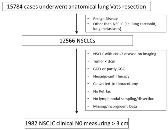 We excluded from our population study those patients who did not undergo a PET/CT scan before surgery and those with suspected Hilo-mediastinal lymph nodes at CT and/or PET, even if investigated by the (mini) invasive staging of the mediastinum [3]. Moreover, we excluded NSCLC patients who were converted to thoracotomy, those who underwent neoadjuvant treatments, and those with a pathological diagnosis that was different from NSCLC (see the consort diagram reported in Figure 1). We also did not consider patients with sub-solid/non-solid NSCLC, synchronous lung cancer, or multiple nodules.