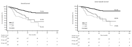 The five-year overall survival (Figure 2) was 73.1% in pN0 patients vs. 35.3% and 31.1% in pN1 and pN2 patients, respectively (p < 0.0001), while five-year cancer-specific survival was 81.1% in pN0 vs. 40.0% and 37.8% in pN1 and pN2, respectively (p < 0.0001).