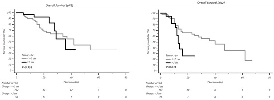 Overall survival according to the tumour dimension in patients with pN1 and pN2.